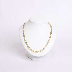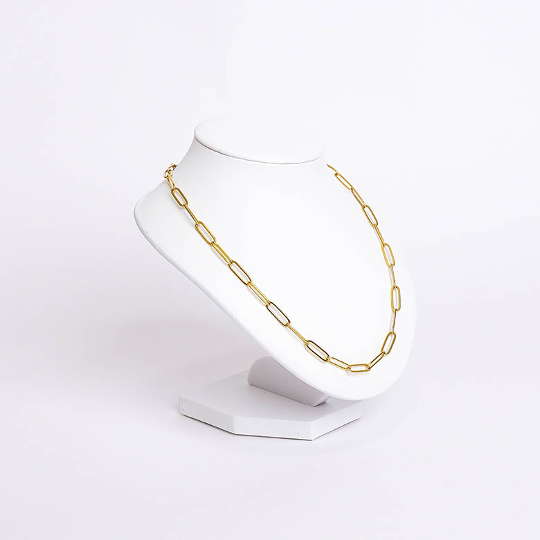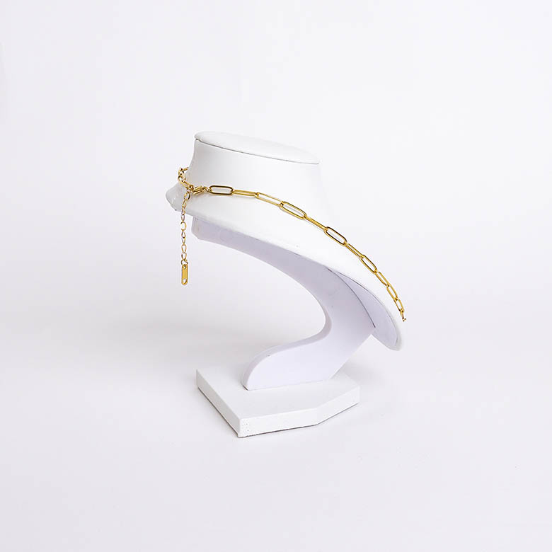 Elegante y compacto, este busto exhibidor de collar está fabricado en cuero blanco ecológico con textura suave tipo terciopelo, ideal para resaltar collares, cadenas o dijes en vitrinas o mostradores. Su diseño sobrio y moderno aporta una presentación profesional sin quitar protagonismo a las joyas.